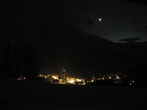 Das obligate Stimmungsbild darf nicht fehlen, denn die Mondsichel über Mariazell ist ein wirklich reizvoller Anblick, der leider fotografisch nicht annähernd festzuhalten ist, da die subjektive Vergrößerung des Mondes, die unser Gehirn bewirkt, nicht funktioniert und der Mond so klein - und dazu noch überbelichtet - dargestellt wird. Trotzdem nett ...
