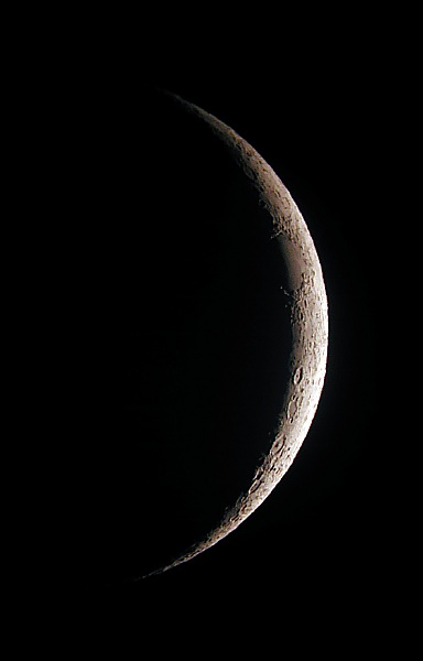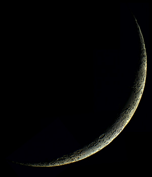 Ich montiere trotz des schlechten Seeings die WebCam, allerdings nur am Refraktor. Zu meinem Erstaunen kann Registax mit den ca. 300 Frames langen Videos doch einiges anfangen und passable Bilder machen. Aus vier Aufnahmen gelingt ein Mosaik der gesamten Mondsichel, das, verkleinert und nachbearbeitet, dann doch recht beachtlich wird. Man kann also auch bei schlechtem Seeing durchaus brauchbare Ergebnisse erzielen. Die Video- Technik macht es möglich!