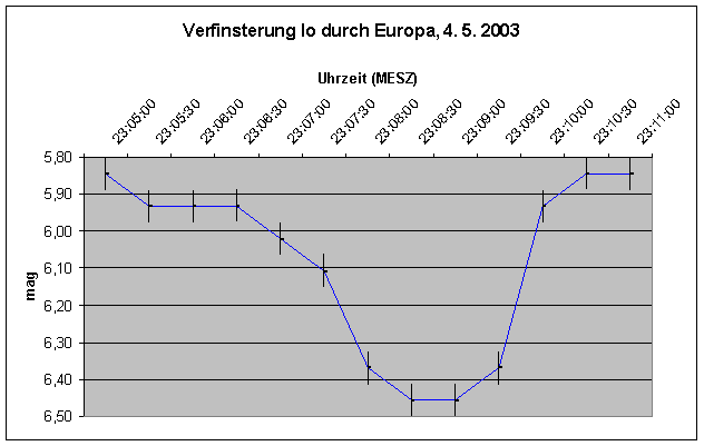 | Bericht: | Eine phantastisch klare Nacht, doch nach der langen Beobachtungsnacht zuvor am NTT bin ich einfach zu müde um noch einmal Stunden hinter dem Teleskop zu verbringen, und morgen ist leider Montag. Doch der Beobachtungsaufruf von Wolfgang Vollmann lässt mich meine kleinste Ersatzeinheit hervorkramen und zumindest die sehr schöne Verfinsterung des Jupitermonds Io durch Europa beobachten. Ich schätze die Helligkeiten nach der Argelander-Mehtode und erhalte die folgende Lichtkurve: Wieder verläuft der Helligkeitsabfall langsamer als der Helligkeitsanstieg; der ist so rasch, dass meine 30 Sekunden-Intervalle fast zu lang sind. Eine sehr schöne Erscheinung, schade, dass die Serie bald zu Ende geht. Rasch noch ein Blick zur nahen Praesepe und dann heisst es doch: Gute Nacht!