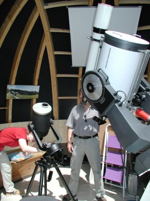 Beobachten auf der Raiffeisen-Volkssternwarte in Mariazell beginnt immer mit einem Blick zur Sonne, so sie noch scheint. Diesmal ist es früher Nachmittag, denn wir beginnen um 15 Uhr mit unserem CCD-Kurs. Da geht sich noch ein Blick zur Sonne aus. Oder zwei. Da wir im Weisslicht und im H-Alpha gleichzeitig beobachten wollen, hat Anneliese ihr C8 in die Kuppel gestellt. So entsteht hier ein eigenartiges Gedränge. |