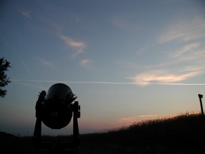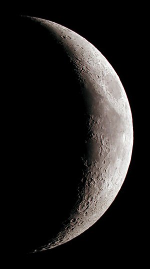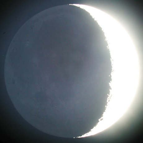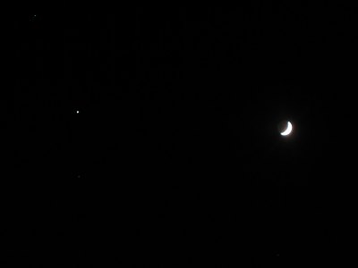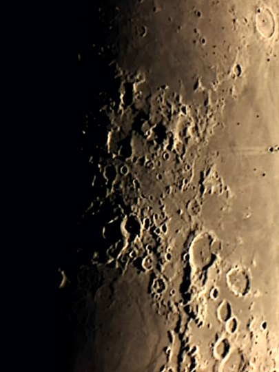 Der Mond steht nahe bei Jupiter und der laue Abend lädt ja doch zum Beobachten ein, auch wenn gerade keine besondere Himmelserscheinung lockt. Schon knapp nach Sonnenuntergang ist der Mond ein lohnendes Objekt. Nach ein paar Schnappschüssen mit der Digitalkamera am 40mm Pentax-Okular beginne ich, mit der WebCam zu experimentieren.