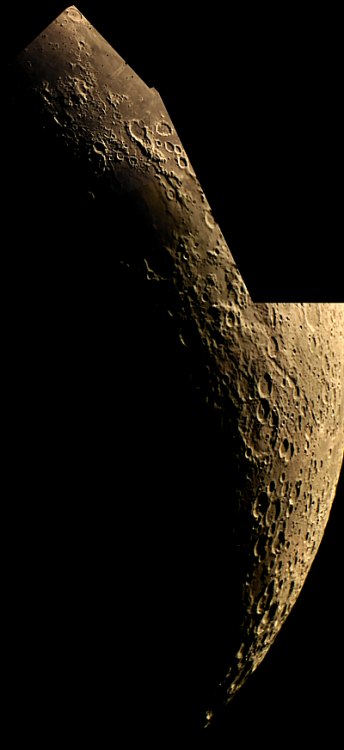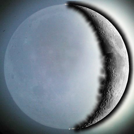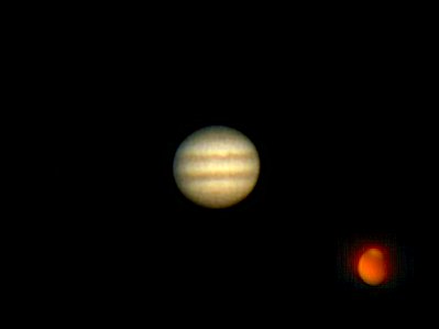 Alle Bilder sind hier verkleinert wiedergegeben. Auch das aschgraue Mondlicht hat es mir angetan. In Verbindung mit dem nahe stehenden Jupiter ergibt sich ein wunderschöner Anblick, der sich fotografisch leider nicht gut festhalten lässt. Im 40mm Pentax-Okular ist das aschgraue Mondlicht sehr detailreich und auch gut im Bild festzuhalten, wenn man die beleuchtete Seite des Mondes nur ordentlich überbelichtet. Später überkommt mich die Lust zum Experimentieren und ich montiere die oben gewonnene Montage (DigiCam-Bild plus WebCam-Mosaik= noch einmal in diese überbelichtete Aufnahme. Da entstehen zwar einige kontrastbedingte Artefakte, aber interessant ist es allemal. Zum Abschluss noch ein Blick zum Jupiter. Unerwarteter Weise ist er trotz seiner geringen Höhe noch recht ruhig und daher widme ich ihm auch noch einmal eine WebCam-Sequenz. Beim Stacken merke ich, wie klein der Planet jetzt schon erscheint. Ich kann es nicht lassen und bilde Mars, den ich am Vortag aufgenommen habe, in gleichem Maßstab (3m Brennweite) ab. Nein, Mars steht nicht so nahe bei Jupiter, das ist eine Montage aus zwei Aufnahmen (Mars am Morgen des 3., Jupiter am Abend des 4. Juni, als Größenvergleich). Noch ein Blick zu Gamma Virginis - im 14mm Pentax ist er noch zu trennen - und zu Gamma Leonis, dann baue ich ab. Deep Sky ist um diese Jahreszeit unter der Woche leider kein Thema ... |