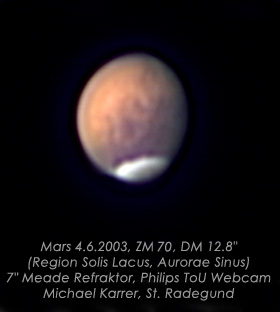 | Bericht: | hallo marsbeobachter, schlaflosigkeit kann bisweilen positiv sein. bei brauchbar gutem seeing mein jüngstes webcam foto. resultat aus 300 gemittelten bildern (mit REGISTAX sortiert aus 6 AVI sequenzen zu 600 bildern). 3x televue barlow, projektion auf 3,5x hochgezogen, dadurch brennweite bei 5,6m (f 30). mbg michael karrer mkarrer@gmx.at