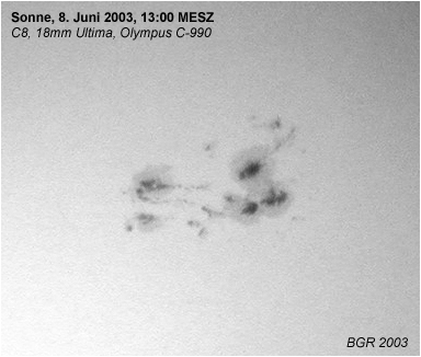 | Bericht: | Die Sonne zeigt heute einige interessante Fleckengruppen, die größte nahe der Sonnenmitte. Blickweise ist sogar die Luftruhe recht gut (ein kleines Wunder bei 30 Grad und jeder Menge Hauswände), also schnappe ich mir die Digitalkamera und halte sie einfach hinter das Okular. Wie immer ist es ein Unterfangen auf gut Glück, denn der Bildschirm meiner Olympus C-990 verrät nichts über die Schärfe und das anvisierte Ziel. Ist er orange, dann ist die Sonne drauf - alles andere muß ich dem Zufall überlassen. Ich mache ca. 10 Bilder mit dem 25mm SMA und 10 mit dem 18mm Ultima, dann setze ich mich zu Registrax und Photoshop und versuche, ein paar Details aus den Aufnahmen zu kitzeln. Das Ergebnis ist halbwegs gelungen - und unter untenstehendem Link zu sehen. Hier die Details dazu: Das große Sonnenbild ist völlig unbearbeitet, die kleinen Inserts sind (von links nach rechts): 8 Bilder 25mm SMA gestackt mit Registrax, 1 Bild 18mm Ultima geschärft in Fireworks und (ganz rechts) 7 Bilder 18mm Ultima gestackt mit Registrax.