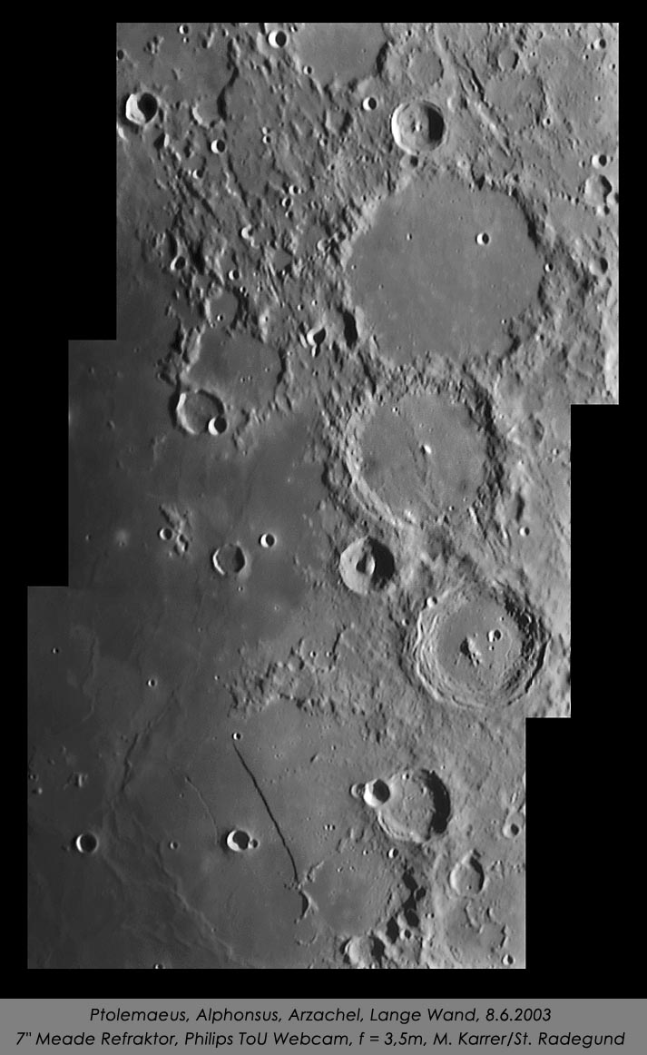 | Bericht: | hallo astrofreunde, die luft hat gewobbelt, aber die verzerrten mondbilder waren in sich scharf. 50 bilder gemittelt (obwohl natürlich keines exakt aufeinanderpasst!). welchen detailreichtum könnte man abbilden, wenn es wirklich einmal ein 1er seeing gäbe! mfg michael karrer