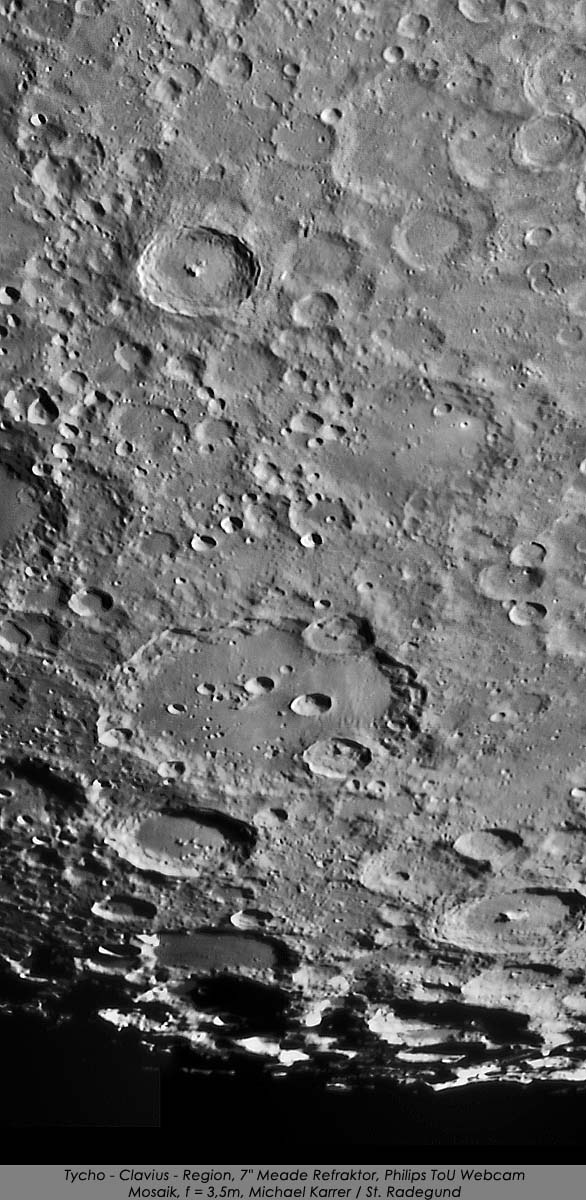| Bericht: | hallo astrofreunde, tycho-clavius region bei seeing 2-. mosaik aus mehreren AVI's zusammengesetzt. jedes AVI nur 150 bilder, davon die besten 50 gemittelt. mehr rohbilder je AVI aufzunehmen hätte wegen der relativ scharfen, aber in sich verzerrten einzelbilder nicht sinn gemacht. bearbeitung mit adobe photoshop. mfg michael karrer