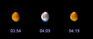 wohlweislich meine Wohnung auf Aussentemperatur gehalten. Trotzdem, das Seeing ist erbärmlich. Manchmal ist das "Gewabbere" doppelt so gross wie der Mars. Hoffnungslos? Was soll's, ich bin nun schon einmal auf den Beinen, also mache ich ein paar WebCam-Sequenzen. Die 2x-Barlowlinse kann man vergessen. Also fokal, bei F=3000. Und siehe da, einige Bilder werden sogar. Und als kleinen Nebeneffekt kann ich erstmals für ein kurzes Stück verfolgen, wie der Planet rotiert. ![]() Die mittlere der drei Aufnahmen wurde mit einem Blaufilter (WR 38A) aufgenommen, der Filter verstärkt den Kontrast schon deutlich und hebt atmosphärische Strukturen hervor. Zwischen der ersten und der dritten Aufnahme erkennt man deutlich die Rotation des Planeten. |