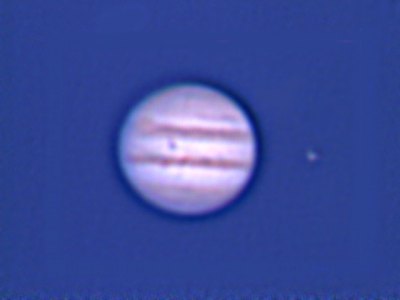 Nach dem Verschwinden der Sonne - noch vor dem astronomischen Sonnenuntergang - ein Blick zum Jupiter, und der Planet hat eine Überraschung für uns bereit; ein kleiner, dunkler Punkt in der EZ ist kein Schatten eines Mondes, sondern der Mond Ganymed, der gerade vor Jupiter vorbeizieht. Ich packe die WebCam aus, und trotz taghellem Himmels und nicht optimalen Seeing gelingt mir noch eine brauchbare WebCam-Sequenz. Das hätte ich mir nicht gedacht - noch einmal Jupiter in diesem Jahr.