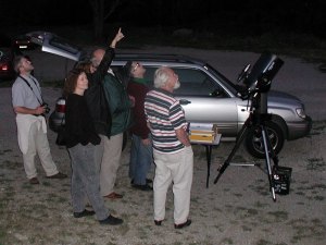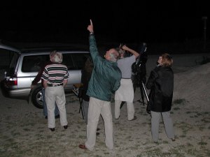 Ich benütze die helle Dämmerung, um mit dem nach GPS eingerichteten Teleskop Arcturus zu finden. Ergebnislos. Genaueres Studium des Handbuchs zeigt eine andere, leichtere Methode: Das Teleskop auf dem ebenen Stativ so ausrichten, dass das Panel nach Süden zeigt (wo hier Süden ist, weiss ich ziemlich genau); dann das Teleskop auf den Nordpunkt richten (Höhe 0°, Azimut 0°) und einschalten. Den Hinweis, dass man nicht in die Sonne schauen soll (no na), mit der Taste "5" quittieren und nicht auf automatisches Alignment gehen. Über das Star-Menü Arcturus auswählen, Enter - Goto. Autostar 2 fragt nach Uhrzeit, Datum und Sommerzeit und holt dann über GPS den Ort (warum nicht auch die Uhrzeit ???). Ein Surren, ein Piep, und Arcturus ist im Sucher nahe dem Fadenkreuz. Erkenntnis drei: Wenn man die Südrichtung kennt, kann man sich die sieben Minuten lange Initialisierungsprozedur des Autostar glatt ersparen! Andreas baut einen 60mm Refraktor auf, und um die beiden Instrumente - zu denen sich später noch ein ETX und ein Myiauchi gesellen - beginnt ein reges Treiben, das in Worten bestenfalls so beschrieben werden kann: In der Gruppe macht Astronomie einfach noch mehr Spass! Und vor allem unsere Einsteiger(innen) profitieren von dem regen Erfahrungsaustausch. Nachdem Bilder mehr sagen als Worte, hier ein paar Stimmungsfotos: