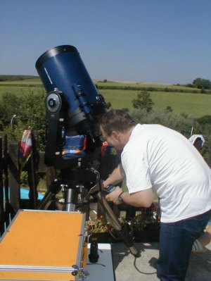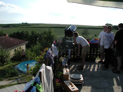 Nach dem Vortrag zum echten Himmel. Ein Traum! Die Milchstraße zieht hoch über unsere Köpfe hinweg, und unsere Sternführung unter dem Motto "Die Lebensgeschichte eines Sterns" beginnt im Schützen mit dem Lagunen- und dem Omega-Nebel! Über M23 und M11, zwei offene Sternhaufen, geht es zu den Doppelsternen Albireo (Beta Cygni) und Ras Algethi (Alpha Herculis), an deren Farbunterschied erklärt wird, was ein Roter Riese ist. Dann folgen mit dem Hantel- und dem Ringnebel in der Leier schon zwei Objekte aus den Endphasen der Sternentwicklung, bis im LX-200 dann noch der Cirrus-Nebel als Überrest einer Supernova bewundert wird. Doch dann geht Mars auf, und wenig später der Mond. Jetzt werden keine anderen Objekte mehr beobachtet ...