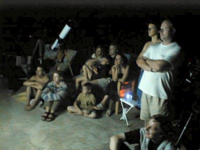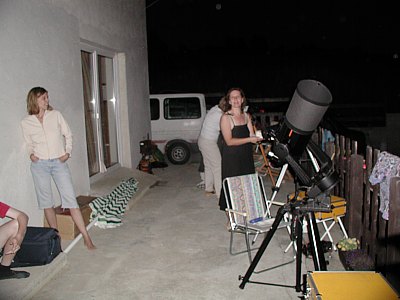 Die helle Hauswand bringt uns auf die Idee, den geplaneten Kurzvortrag über den Sternenhimmel - inklusive Südhimmel-Spezial als Reisevorbereitung - open air stattfinden zu lassen. Unseren Ausführungen schliessen sich mehr Gäste an als erwartet und nicht nur unsere Jugend, die ja vom "Astro-Virus" schon längst befallen ist, sondern auch viele Erwachsene entdecken ihre Liebe zum Weltall (wieder).