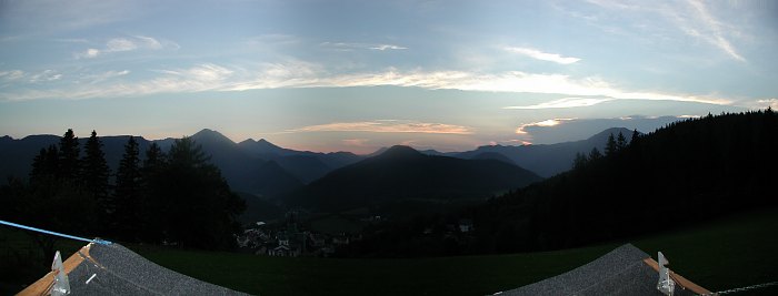 Ich mache ein paar Tage Urlaub in Mariazell, natürlich auch mit dem Hintergedanken, die hiesige astronomische Infrastruktur intensiv zu benützen, wenn es das Wetter zulässt. An diesem Mittwoch scheint dies nicht der Fall zu sein. Es würde wohl auch nichts mit der Führung werden, die zu halten ich mich freiwillig gemeldet hatte. Doch der Nachmittag verläft interessant; je mehr ich mich Mariazell nähere, desto heller wird es, der Regen läßt nach. Und auch in Mariazell wird es von Minute zu Minute freundlicher. Abendessen in der Sonne auf der Terrasse der Pizzeria Weinstadl! Also beschliessen Angelika Eder und ich, die Führung stattfinden zu lassen. Ich fahre schon einmal hinauf und bereite die Sternwarte vor. Abgesehen von ein paar Gewitterwolken im Nordwesten erwartet mich ein sehr freundlicher Abend, mild, windstill und klar.