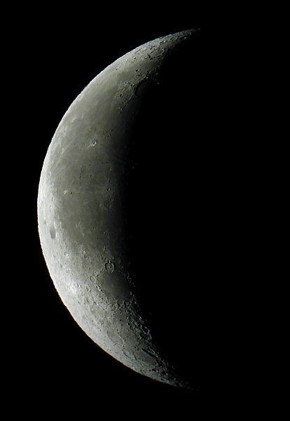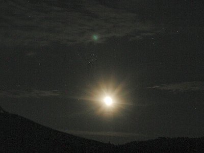 Ein Blick zum Mars: Grauslich! Das Seeing ist so schlecht, dass sich keine Aufnahme lohnt. Es wird hell. Die Dämmerung? Zu früh! Das ist es: Die dünne Sichel des abnehmenden Mondes geht auf. Was für ein Anblick: Der Mond steht nahe den Pleiaden, und leichte Cirruswolken im Nordosten hellen die Szene zusätzlich auf. Das muss ich im Bild festhalten, so gut es geht. Nur der Mond ist überbelichtet.
