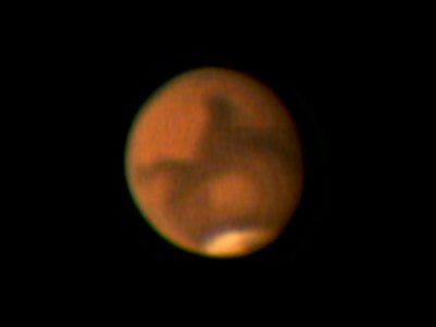 Das Seeing scheint besser geworden zu sein. Es ist gegen 2.30 Uhr. Noch ein Blick zum Mars? Unglaublich, auf einmal ist er ruhiger geworden! Zahlreiche Details sind im Fernrohr zu erkennen. Rasch noch einmal die WebCam montiert, gleich mit 2x Barlowlinse, F=8000 mm.