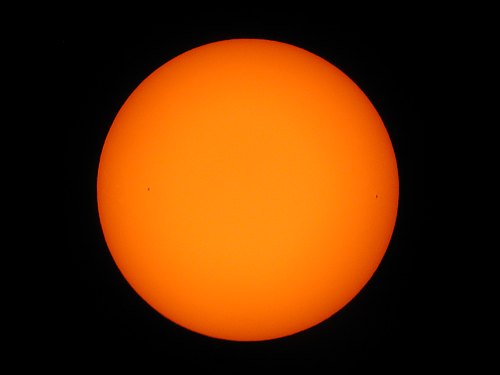 Ich beobachte die Sonne am 5" Starfire Refraktor mit Zeiss SFO 80 Sonnenfilter; nur zwei mittelgrosse Einzelflecken sind zu sehen, keine Spur mehr von den zahlreichen Fleckengruppen der letzten Woche, sie sind mit der Sonnenrotation verschwunden.