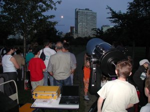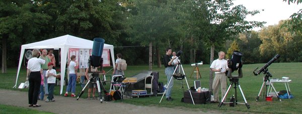 Was für ein Unterschied zur Vorwoche. Heute herrscht wunderschönes Sommerwetter, und daher beschliessen wir, in ungewohnt starker Besetzung aufzutreten: Gleich vier leistungsstarke Teleskope stehen zur Verfügung! Freilich, aus unserer Erfahrung konnten wir erahnen, wie gross der Andrang an so einem Abend sein würde.