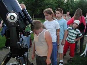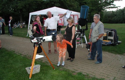 ![]() Noch vor Beginn des Programms lockt der helle Stern Arcturus jung und alt ans Fernrohr - und das bei hellblauem Himmel und Sonnenschein! |