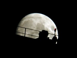 Alle warten auf den Mond. Doch der spielt mit uns Verstecken. Zunächst taucht er über dem Austria Center auf, um kurze Zeit später wieder hinter der UNO-City zu verschwinden. Nach seinem erneuten Auftauchen kann er endlich beobachtet werden, auch wenn leichte Wolken etwas stören.