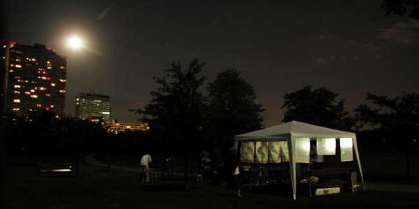 Es ist heute windstill und wir können unsere Station daher wie geplant und ohne Probleme aufbauen. Nur eine Sache schafft Kopfzerbrechen: Der Mond geht tief im Südosten auf und wir müssen zwischen den nahen Kirschbäumen und den weiter entfernten Hochhäusern geeignete Blickschneisen finden. Das erfordert das Umsetzen so manch schweren Teleskops.