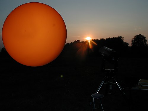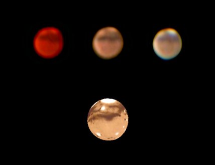 | Bericht: | Der unerwartet schöne Nachmittag verleitet zu einem spontanen Beobachtungsabend auf der Sofienalpe. Mond und Mars sind das Ziel. Doch der Aufbau erfolgt noch bei hellem Sonnenschein, obwohl unser Stern schon deutlich früher untergeht als noch vor ein paar Wochen. Also rasch ein Blick zur Sonne. ![]() Sonne, durchs Fernrohr schon recht unscharf so nahe am Horizont Dann geht sich auch ein Blick zu Merkur und Jupiter aus. Merkur ist sehr klein und schon recht blass, mit Phantasie erkennt man eine Phase. Jupiter ist nur mehr ein Hauch. Ein Wunder, dass er überhaupt noch zu erkennen ist, drei Wochen vor der Konjunktion! ![]() Gewitterwolken am Horizont Der nächste Höhepunkt ist ein Wetterballon, der malerisch über den Himmel zieht und in bester Star Wars-Art explodiert. So etwas bekommt man mit Geduld immer wieder vor die Linse. ![]() Action! Das erste Gestirn, das wirklich zum Beobachten einlädt, ist unser Mond. Malerisch steht er in der Dämmerung, und noch malerischer verläuft sein zuerst pastellfarbener, dann tiefroter Untergang. ![]() Der zunehmende Mond ![]() ![]() Dann beginnt das Warten auf den Mars, das mit der Beobachtung von Doppelsternen und Deep Sky Objekten überbrückt wird. Ras Algheti, Albireo, Epsilon Lyrae, M13, M57, M11, M17 und M27 sind die Stationen. Für schwächere Objekte ist es zu dunstig. Dann Mars. Anfangs ist das Seeing noch sehr schlecht, dann etwas besser, dann wieder schlechter. Doch eine Struktur stimmt nachdenklich: Da, wo Hellas sehr knapp am Rand stehen sollte, zeigt sich ein heller Fleck, fast so hell wie die südliche Polhaube. Der Blaufilter zeigt es deutlich - nicht weiss, sondern gelb. Das könnte ein gewaltiger Staubsturm sein. Na hoffentlich wird der nicht größer! ![]() Die Aufnahmen zeigen Mars mit Orangefilter (#23A) links, ohne Filter (Mitte) und Blaufilter (#80A) rechts, darunter die Simulation mit Mars Previewer, die deutlich zeigt, dass Hellas noch nicht so dominant sein sollte. Die Aufnahmen entstanden aus WebCam Videos zu je ca. 500 Frames mit 1/33s Belichtungszeit bei F=3000mm. |