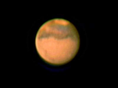 | Bericht: | Ein wunderschöner Nachmittag lädt wieder einmal zum Beobachten ein. Die Sofienalpe zeigt sich heute ziemlich verwaist, wahrscheinlich sind die meisten doch weiter hinaus gefahren. Eigentlich schade, denn hier sind die Bedingungen so gut wie perfekt. Einige Cirren lösen sich rasch auf, und der leichte Dunst ist auch anderswo störend. Dafür heute erstmals: Wirklich gutes Seeing! ![]() Ein malerischer Sonnenuntergang mit letzten Restwolken Die im Westnordwesten untergehende Sonne verleitet noch zu einem Blick - der Sonnenfilter ist im Sommer immer mit dabei. Und siehe da, das Seeing ist auch in dieser geringen Höhe erstklassig. Die Sonne zeigt sich auch wieder mit mehr Flecken, die aktiveren Gebiete kommen wieder zum Vorschein. ![]() Ein ungewöhnlich scharfer Sonnenuntergang mit Fleckengruppen und Fackelgebieten. DigiCam-Schnappschuss durch 50mm Plössl Das nächste Objekt ist noch nicht der Mond, sondern Merkur. Durch das gute Seeing bedingt erkenne ich im 14mm Pentax deutlich die Phase des Planeten und wage sogar eine WebCam-Sequenz. Mit Erfolg, es gelingt mir, die Phase des Planeten deutlich einzufangen. Nicht schlecht bei 6" scheinbarem Durchmesser in wenigen Grad Höhe. ![]() Merkur in der Dämmerung, mit deutlicher Phase. Mittel aus ca. 400 WebCam-Frames zu je 1/50 Sekunde Belichtungszeit. Das Bild wurde nachgedunkelt, um vor allem das sekundäre Spektrum zu eliminieren. Dann ist natürlich der Mond das nächste Ziel. Sein Untergang erfolgt fast genauso malerisch wie am Vorabend. Das gute Seeing macht ihn zum vielbestaunten Beobachtungsobjekt, dem sich auch unsere - heute nicht allzu zahlreichen - Spaziergänger nicht entziehen können. ![]() Malerische Dämmerungsstimmung mit Mond ![]() Zunehmender Mond. DigiCam-Schnappschuss, 50mm Plössl. Bis der Mars auftaucht ist viel Zeit für Deep Sky, und da zeigen sich die Bedingungen wirklich auch recht brauchbar, abgesehen von der Transparenz, die bei tief stehenden Nebeln unangenehm aufällt. Aber das gute Seeing macht alles wett. Im 7mm (!) Pentax bei rund 430-facher Vergrößerung sind die Kugelsternhaufen M13 und M92 einfach so atemberaubend, dass man sie minutenlang still bewundern muss. Und dann M57; ich dachte zunächst an eine Einbildung und verhielt mich ganz still, doch Walter Kuba, am Teleskop nicht so erfahren und daher voreingenommen wie ich, bestätigt es unabhängig: Farbe!!?? Ja, in der Tat; der äußere Rand des Ringnebels ist deutlich schärfer als der innere, so soll es auch sein; aber er ist im Grauton auch deutlich wärmer! Man kann nicht sagen, dass man den Nebel "bunt" sieht, aber auch nicht ganz schwarzweiss. Es ist ein Hauch von Farben drin, vor dem dunklen Himmelshintergrund. Einzigartig! Mit 40mm Pentax und UHC-Filter geht es an die großflächigeren Objekte: M27 ist traumhaft (übrigens auch schon ohne Filter sehr gut zu sehen und mit O-III-Filter noch viel besser), M17 sehr deutlich und M8, obwohl tief, auch noch schön. NGC 6781 ist deutlich. Ohne Filter, dafür aber wieder mit 7mm Pentax, ein paar planetarische Nebel: Der Blinking Planetary NGC 6826 strahlt heute blau und blinkt nicht, kein Wunder bei dieser Vergrößerung; man erkennt den Nebel samt Zentralstern deutlich. NGC 7027 ist deutlich als zwei rundliche, kleine Nebelscheibchen zu erkennen und der Saturnnebel NGC 7009 zeigt seine charakteristische Form. Wirklich gut! Mit 14mm Pentax dann noch zu NGC 6905, dem kleinen planetarischen Nebel im Delphin, und zu M15, der wiederum ein traumhaftes Objekt abgibt. Aber dann ist Mars da ... Ein erster Blick durch das 14mm Pentax zeigt den Planeten so ruhig wie noch nie; leider nicht ganz ruhig, langsame Seeing-Wellen deformieren ihn trotzdem. Aber es reicht, um bei dieser Vergrößerung bisher noch nie gesehene Details erspähen zu können. Vor allem mit Blaufilter (#80A) fällt auf, dass die kleine südliche Polkappe schon deutlich durch die Polhaube durchschimmert. Im Orangefilter (#23A) kommen viele kleine dunkle Details heraus. Mit der WebCam mache ich ungewöhnlich lange Sequenzen von jeweils rund 1.600 Frames zu je 1/50 bis 1/100 Sekunde Belichtungszeit, und das mit 2x-Barlowlinse! Auch wenn sich Registax recht hart tut und einige Artefakte produziert, die Ergebnisse können sich durchaus sehen lassen: ![]() Mars mit #80A Blaufilter, Mittel 15% aus 1.600 Frames ![]() Mars mit Orangefilter #23A, Mittel 15% aus 1.600 Frames ![]() Marskarte aus Mars Previewer zu diesen Bildern Ein kleines Detail macht stolz: Der weiße Fleck "Nix Olympica", von der Lage identisch mit dem Riesenvulkan Olympus Mons, allerdings nicht der Berg selbst, sondern seine Gipfelwolke. Der Rest auf dieser eher uninteressanten Seite des Planeten, die vornehmlich aus der hellen, strukturlosen Ebene Tharsis besteht, ist nicht allzu interessant. Leider wird das Seeing jetzt schlechter. Ein Versuch mit der 3x-Barlowlinse bringt nichts mehr. Dafür zücke ich die CCD-Kamera und mache mich auf die Jagd nach Phobos und Deimos. Es kostet mich viel Mühe bei der Ausarbeitung, aber ich kann die beiden Monde isolieren, allerdings an der Grenze. Visuell war nichts zu holen, der Dunst und damit das Streulicht zu stark. ![]() Phobos und Deimos; 10-Sekunden-CCD-Aufnahme, ultrahart ausgearbeitet. Phobos geht fast im Streulicht unter. Auch das Seeing war leider nicht mehr so gut, daher wurden die schwachen Objekte auch noch verwaschen. Und da ich schon die CCD-Kamera montiert habe, noch ein kurzer Schwenk zu Uranus. Mit 3m Brennweite kann ich auch hier drei Monde herausholen. ![]() Uranus, 15 x 15 Sekunden, hart ausgearbeitet So endet ein ereignisreicher Streifzug durch das Sonnensystem mit Abstecher zu Deep Sky Objekten. Die Bedingungen rechtfertigen mittlerweile den Abbau, und es ist ohnedies schon 1.30 Uhr ... |