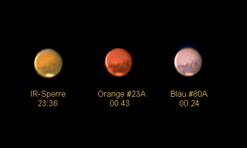 Es ist ein Wochentag, und trotzdem mache ich mich auf die Sofienalpe, um Mond und Mars zu beobachten, und das kann bekanntlich bis nach Mitternacht dauern. Trotzdem. Ein wunderschöner, lauer Sommerabend, der tief stehende Mond taucht die Szenerie in ein fahles, aber nicht unangenehmes Licht, Grillen zirpen, es ist eigentlich kitschig schön. Neben dem Mond, der den Himmel aufhellt, gibt's kaum etwas zu beobachten, ausser vielleicht ein paar Doppelsternen. Der Mond ist sowieso das zentrale Beobachtungsobjekt, so lange er noch hoch genug steht. Das Seeing ist anfangs recht gut, und neben einem DigiCam Schnappschuss durch das 50mm Plössl geht sich auch eine recht gute WebCam-Sequenz von Copernicus aus, der nahe am Terminator steht. Neben mir haben Andreas und Astrid einen 8" Dobson aufgestellt, um ihn zu testen. Sonst beobachtet zunächst niemand hier auf dem "Hügel". Aber unsere beiden Instrumente locken einige, vorwiegend junge Leute an, die den lauen Abend für einen Spaziergang (mit oder ohne Hund) nützen. Bald ergibt sich ein sehr nettes, lockeres Geplaudere über Astronomie und wo und wie man am besten beobachten kann, und über Star Parties und wie man Astronomie auch anders als steif und förmlich vermitteln kann. Allein diese nette, spontane Runde war die Fahrt auf die Sofienalpe schon wert! Der Mond steigt tiefer, hellt den Himmel aber immer noch sehr auf. Andreas und Astrid fahren heim, dafür kommt rechtzeitig vor dem Mars noch ein anderer Sterngucker mit einem C8. Ich geniesse eigentlich mehr die Stimmung und fahre ein wenig mit dem LX-200 in der Gegend herum. Ja, ein paar Objekte kommen auch durch das helle Mondlicht: M13, M15, M11 sind ganz nett. Einen sehr alten Bekannten besuche ich auch nach vielen Jahren wieder: Den Doppelstern Zeta Aquarii. Er zeigt mir, dass das Seeing in geringer Höhe nicht hoffnungslos ist. Ich lasse mir vom LX-200 ein paar Objekte in der Gegend des Adlers vorschlagen und stosse auf den offenen Sternhaufen NGC 6709, der auch ein sehr nettes Objekt ist. Doch jetzt kommt Mars. Ich lasse den Planeten hinter den Bäumen vorbeiwandern und beobachte ihn erst, als er gegen 23.30 Uhr den letzten Baum passiert hat. Er steht jetzt 15° hoch, nicht viel, aber besser als gar nichts. Ein Blick durch das 14mm Pentax zeigt: Es flimmert etwas, aber es sind Details da. Die "uninteressante" Seite mit der riesigen Tharsis-Region. Aber um die immer noch sehr dominante, aber doch schon deutlich kleinere Polkappe ein grosses, strukturiertes, dunkles Gebiet. Mit einem Orangefilter (#23A) sehe ich in diesem Gebiet blickweise deutliche Strukturen. Es geht an die WebCam. Mit 2x-Barlowlinse ist nichts zu machen, aber Mars ist schon so gross, dass auch mit "nur" 3m Brennweite einiges zu holen ist. Ich war mit meinen Aufnahmen der letzten Zeit nicht zufrieden, vor allem nicht mit dem Farbton, und experimentiere daher ein wenig. Und lerne zwei wichtige Dinge. Erstens: Nicht unterbelichten. Unter einem gewissen Signal/Rauschverhältnis ist auch Registax chancenlos. Zweitens: Viel, viel Zeit lassen beim Fokussieren. Ich fokussiere an Atair, muss zwischendurch aber umfokussieren, wenn ich Farbfilter verwende (die optische Dicke der Filter ist nicht vernachlässigbar). Ich habe sogar knapp vor der Marsbeobachtung den Fangspiegel an Atair kollimiert, er war ganz, ganz wenig dekollimiert. Von elf Videosequenzen ist nur eine ein Totalversager; aus den restlichen kann ich trotz des nicht mehr so optimalen Seeing und 90 Prozent Qualitätsschwelle zwischen 20 und 240 (!) Frames verwerten. Es kommt wirklich weniger auf das Seeing als auf den Fokus an. Die beste Aufnahme ohne Farb-, aber mit IR-Sperrfilter entsteht aus 142 verwertbaren Frames mit 1/50s Belichtung (ohne IR-Sperrfilter hätte 1/250s ausgereicht, aber die Farben und das Rauschen waren nicht befriedigend). Mit Orangefilter (#23A) belichte ich 1/33s, hier erwische ich die beste Phase mit einem Video, von dem gleich 236 Frames die 90 Prozent-Hürde schaffen. 1/25s brauche ich für die Aufnahmen mit dem Blaufilter (#80A), die Kamera ist eindeutig nicht blauempfindlich. Aber auch hier schaffen es 101 Frames zum besten Bild. Die Bilder werden mit Registax gestackt und mit einem leichten Wavelet-Filter geschärft, anschliessend entferne ich mit Giotto das sekundäre Spektrum. Der andere Weg (mit Registax stacken, dann mit Giotto die Farbränder eliminieren und dann nochmals mit Registax den Wavelet-Filter anwenden) erweist sich als falsch, es kommt dabei nichts brauchbares heraus. Es kommen enorm viele Details heraus, mehr, als ich visuell sehen konnte. Wieder hilft Mars Previewer beim Identifizieren der Strukturen. Besonders erfreut mich der Umstand, dass auf der rotgefilterten Aufnahme nicht nur (die Gipfelwolke von) Olympus Mons, sondern von mindestens zwei der drei übrigen Tharsis-Vulkane zu sehen ist (Arsia, Pavonis und vielleicht auch Ascraeus). Auf der blaugefilterten Aufnahme erkennt man deutlich eine blaue Dunstwolke über dem Mare Chronium nahe der südliche Polhaube. Alles in allem eine sehr nette Nacht mit zufriedenstellenden Mars-Ergebnissen. Mal sehen, wie das ganze bei wirklich gutem Seeing gelingt, falls es dieses einmal gibt ... |
