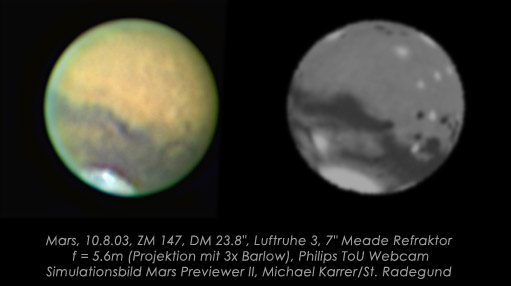 | Bericht: | hallo astrofreunde, auch ein so beständiges hochdruckgebiet garantiert keine gute luftruhe. durch zirren in der luftqualität beeinflußt, der jüngste mars nach meiner urlaubszeit. eine besondere herausforderung wäre die zerbrochene polkappe bei gutem seeing aufzunehmen, teilweise sind spitzenlichter zu erkennen. ob es sich bei den gescheckten zonen wirklich um die vulkanregionen handelt, bin ich mir nicht sicher. die positionen stimmen etwa, aber bei der durchschnittsluft und nur 7" öffnung? mfg michael karrer