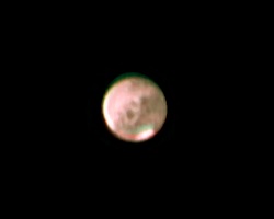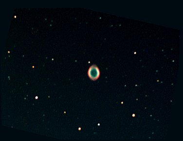 Der helle Fleck nahe Jeventae Fons könnte eine Wolke oder ein Staubsturm sein. Langsam kommen wieder interessantere Gegenden zum Vorschein. Ein Problem beim Ausarbeiten bereitet mir der Blaukanal der Philips ToUCam Pro. Er ist, vor allem bei den (nicht veröffentlichten) Aufnahmen mit der Barlowlinse, unbrauchbar. Ich ersetze ihn durch ein 50:50 Mittel aus dem Rot- und dem Grünkanal. Nicht ganz korrekt, aber akzeptabel. Die Durchsicht ist so gut, trotz des Mondes. Ich verlasse Mars, und obwohl es schon recht spät ist, montiere ich doch noch die MX916 CCD-Kamera. Ziel: M57, der Ringnebel. Ich möchte auch hier eine RGB-Aufnahme probieren. Ziemlich am Ende meines Batteriestroms und auch schon ziemlich müde, mache ich nur einige wenige (genauer: je 3 x 20 Sekunden) Aufnahmen, die zudem nicht so gut sind, da das Seeing doch immer schlechter wird. Ein erstes, noch nicht richtig ausgearbeitetes Ergebnis dieser kurzen Aufnahmeserie ist dieses Farbbild von M57; noch nicht ganz korrekt, auch nicht berauschend von der Schärfe wegen des Seeings, aber doch ganz passabel für einen "Schnappschuss" von 3 x 3 x 20 Sekunden. Die Aufnahme entstand mit f/6.3, also einer Brennweite von F=1890mm. Es ist jetzt schon recht unangenehm kühl und ausserdem schon recht spät für einen bald bevorstehenden Arbeitstag, also beende ich meine Aktivitäten. Zwei weitere nächtliche Spaziergänger halten - vergeblich - Ausschau nach Perseiden. Wenn die Leute doch nicht alles glauben würden, was in der Zeitung steht ... |