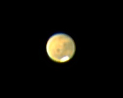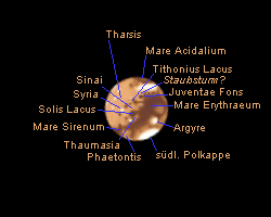 Unverschämt, so ein Wetter an einem 11. August. Man kann es einfach nicht vergessen, was da vor mittlerweile vier Jahren war; der Wetterkrimi, das Bangen und Warten, das Verfluchen der Meteorologen. Hätten wir damals schon Wettermodelle wie Bolam gehabt ... Egal, heute ist es jedenfalls makellos schön, und die Marsmania 2003 treibt seltsame Blüten: Beobachter rücken bei Vollmond aus! Ich bin wie immer etwas früher da, denn ich baue gern bei Tageslicht auf. Heute von Hitze keine Spur, der Wind aus SE ist kühl, im Lauf der Nacht brauche ich einen Pullover. Ungewöhnlich! Ich baue auf dem Hügel auf, gleich neben der verwitterten Tafel, um Mars möglichst früh zu erwischen. Zuerst aber ein Blick zur Sonne: Wieder einige Flecken, und das Seeing in der geringen Höhe ist nicht schlecht. Es ist sehr klar, bald habe ich Arcturus im Rohr, dank gut erratener Aufstellung. Und ein kleiner Versuch ... Maerkur!? Kann das stimmen? So eine grosse Elongation von der Sonne? Es stimmt! Nur die flache Ekliptik vereitelt eine Traumsichtbarkeit, aber im Fernrohr ist der winzige Planet eine deutliche, vom Seeing etwas verzerrte Sichel. Aber Mist! Ich habe mein Instrument genau so aufgestellt, dass die alte Tafel genau, aber genau vor der Öffnung steht. Zum Glück hat sie keine 30cm Durchmesser, aber trotzdem. Ich dachte, in diesem Azimut werde ich nicht beobachten ... Denkste! Unglaublich der weite Blick ins Tullnerfeld, Berge am fernen Horizont. Und ein stahlblauer Himmel. Andreas und Astrid kommen mit ihrem neuen Dobson. Und eine Familie, die eigentlich zum Ferienspiel wollte. Sie sind leider sehr enttäuscht, dass sie Mars noch nicht sehen können - doch der wird erst gegen 23 Uhr hinter den Bäumen hervorkommen. Ich vertröste sie auf den Mond, der aber auch erst in einer guten Stunde sichtbar sein wird, und so kommt zunächst das Restaurant zu Gästen. In der Dämmerung experimentiere ich mit einem 9mm Nagler von Andreas, schon ein schönes Teil. Schon Epsilon Lyrae ist eine Wucht, aber M57 und vor allem M13 sind einfach ein Erlebnis! Diese besonderen Eindrücke teilen auch zwei Spaziergängerinnen mit uns, die sich spontan unserer kleinen Gruppen anschliessen. Unsere Familie von vorhin kommt auch wieder, gerade rechtzeitig, denn jetzt kommt der fast volle Mond hinter den Bäumen hervor. Ohne Graufilter ist heute beim Mond nichts zu machen. An meinem 12" projizieren wir den Mond formatfüllend auf eine weisse A4-Seite, und deutlich sieht man alle Strukturen. Mit einem Graufilter geht es einigermassen. Trotzdem sind wir für Minuten geblendet. Der Himmel ist hell. Vom Kleinen Wagen sieht man nur mit Phantasie die schwächsten Sterne, und das bei dieser tollen Durchsicht. Aber tief im Süden strahlt der Mond wie ein Scheinwerfer. Mars leuchtet zwischen den Blättern des Waldes durch. Die Familie beschliesst, nicht mehr zu warten, sondern uns an einem unserer samstäglichen Sternabende zu besuchen. Ist auch vernünftiger als unter der Woche, und beim Sternabend gibt es auch viel mehr Rahmenprogramm als bei einer doch privaten Beobachtung. Noch einmal ein paar Deep Sky Objekte. M13, M15, M11, ja sogar M17 (!) ist mit einem UHC-Filter gar nicht so schlecht. Könnte jemand den Mond abdrehen? M31, h+Chi Persei, und dann kommt endlich der Rote Planet. Das Seeing ist nicht schlecht. Könnte besser sein, aber für die wichtigsten Details reicht es. Ohne Filter kommen aber ausser der Polkappe nur wenige Details heraus. Mit einem Orangefilter kann man auf dem Mars aber durchaus spazieren gehen. Ich montiere die WebCam erneut (erstes Objekt war bekanntlich Merkur). Für die 2x-Barlowlinse ist das Seeing doch nicht gut genug, aber die Aufnahmen bei 3m Brennweite werden sehr gut. Ich gehe allerdings auch grosszügig mit meinem Speicherplatz um und mache zwischen 1200 und 1600 Aufnahmen pro Video.