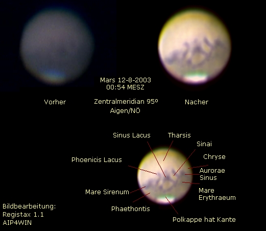 | Bericht: | Mein Bruder und ich wollten Montag das stabile Wetter nochmal richtig zum Mars-Schauen ausnutzen. Wir fuhren zum neu entdeckten Beobachtungsplatz bei Aigen/Lindabrunn südwestlich von Leobersdorf, der bei meinen letzten Beobachtungen eine gute Figur gemacht hatte. Der Beobachtungsplatz an der Südwestausfahrt von Aigen hat einen niedrigen Südhorizont und war, in letzter Zeit, zu meinem Ersatzplatz für Mars-Beobachtungen geworden. Nachdem wir das Teleskop aufgestellt hatten schauten wir nach einem kurzen Blick auf den Mars zum Vollmond und suchten im Plato nach kleinen Krater mit Durchmessern von 5km und weniger. Die Krater sind nicht leicht zu erspähen, die besten Bedingungen stellen sich bei Vollmond oder bei sehr niedriger Sonneneinstralung ein. Das Seeing war mittelmässig das Bild bei 250x schon flau. Ich erspähte nie mehr als 3 Krater und konnte von denen nur den in der Mitte von Plato halten. Die beiden anderen waren nur kurzfristig sichtbar. Mein Bruder, der nachweislich schärfer sieht, kam mit einem orthoskopischen Okular auf 7. Danach wieder zum Mars. Im Binoviewer wurde gerade Solis Lacus geboten. Obwohl die meiste Zeit weniger als durchschnittlich zu sehen war gab es immer wieder gute Momente, in denen eine Reihe von Details zum Vorschein kamen. Plötzlich gab es einen sehr lauten knall der wegen seiner offensichtlichen Nähe fast 3-dimensional wirkte. Es war ein Schuß gefallen. Nach ein paar Minuten tauchten auf dem Feldweg Jäger in Autos mit abgedrehtem Licht auf, die miteinander in Funkkontakt standen. Wer sagt, das angewandte Amateurastronomie nicht auch seine Risiken hat! Gottbewahre, es besteht durchaus eine gewisse Gefahr, einmal als besonders exotisches Großwild verwechselt zu werden (mit Aussicht als Sondertrophee -vielleicht mit einem Nagler Okular im Gebiss- zwischen Hirschen an einer Panelwand angebracht zu werden: "Gemeiner Amateurastronom, erlegt 2003"). Ich war gerade mit dem Scharfstellen der Webcam beschäftigt als ich neben mir die bärtigen Gesichter zweier Jäger wie aus dem Bilderbuch erblickte, sie hatten am Monitor den Mars gesehen. "Schau da ist der Mars! Jetzt los Lois, wir haben noch 2 Schuß Munition, auf wiedersehen, Grüßgott". Ich muß gestehen, daß mir als Tierfreund, die um sich herum ballernde Unholde äusserst unsymphatisch sind. Wir ließen uns jedoch nicht weiter stören und nahmen noch mehrere Videosequenzen auf. Das beste Bild ist unten zum Vergleich mit einem unbehandeltem Bild aus der Videosequenz zu sehen. Ich verwende jetzt zur Bearbeitung nur mehr Registax. K3CCD schlägt zwar punkto Geschwindigkeit (so wie ich es einstelle) Registax gefühlsmässig um Faktor 10, ist aber beim Überlagern der Bilder etwas schleißig. Das Endbild von K3CCD ist etwas unschärfer. Ich habe Tests mit unbearbeiteten überlagerten Bildern gemacht und konnte aus dem Registax-Bild, immer mehr raus hohlen. K3CCD verwende ich nur noch, um vorab die Qualität der Videosequenzen zu überprüfen. Danach bearbeite ich die beste Sequenz mit Registax. Ich warte schon sehnsüchtig auf die angekündigte neue Version 2.0, die über eine eingebaute Rauschunterdrückung verfügen soll. Das Rauschen ist, aus meiner Sicht, der größte Schwachpunkt der WebCams. Dadurch muß man relativ viele Bilder addieren, dann wiederum braucht man das Jahrtausend Seeing, damit die Schärfe erhalten bleibt...