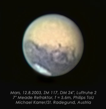 | Bericht: | hallo astrofreunde, variable, aber brauchbare luftruhe am morgen des 12.8.03. visuell ist der kontrast der dunkelgebiete (auch mit filterbeobachtung) gering, ja fast enttäuschend. welch ein unterschied, wenn man ein webcam bild bearbeitet! auch wenn das ergebnis nicht mehr natürlich wirkt - der informationsgehalt steht im vordergrund. die einzelnen "eisberge" der polkappe waren bei 350x mit binokular jedoch ein visueller hochgenuß! mfg michael karrer