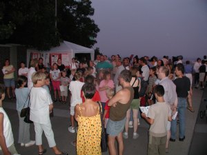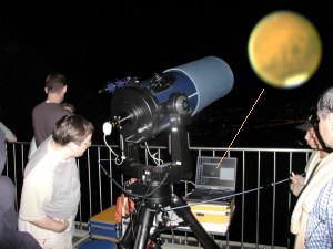 So finden sich schon lange vor Beginn des Sternabends unsere Aktiven mit ihren Instrumenten ein und sehr zum Erstaunen vieler Touristen bauen wir unsere Station auf. Winer Gäste ahnen, dass das ganze mit dem Mars zu tun hat; die Mendien berichten ja bereits ausführlich. Leider hat niemand richtig erklärt, dass Mars durchaus für einige Wochen zu sehen ist, bis Ende September recht attraktiv ist, und nicht nur eine kurzzeitige Erscheinung. Und vor allem, dass Mars jetzt noch nicht am frühen Abend zu sehen ist ...