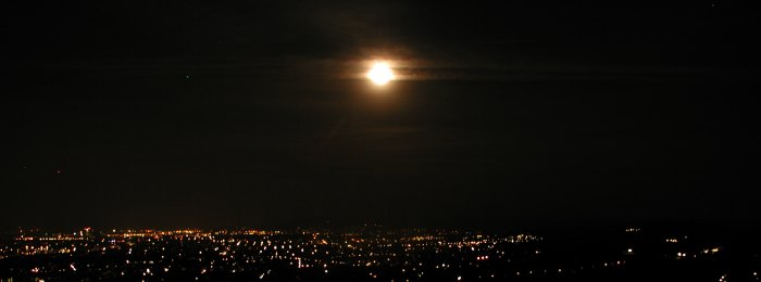 Dunstwolken am Horizont bescheren uns ein interessantes Wettrennen; während der Mond höher steigt, steigt auch der Dunst, und wiederholt versucht der Erdtrabant vergeblich, den Wolken zu entkommen. Doch er kann dieses Rennen nur gewinnen. Die Wolken werden im Lauf der Nacht weniger, und die Drehung der Erde hebt den Mond schliesslich hoch genug, um ihn über den Wolken strahlen zu lassen.