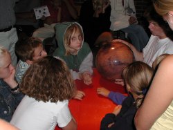 Der Mond ist doch der beste Promotor für Astronomie; alle erkennen spielend die Mondlandschaften im Fernrohr und sind von deren Vielfalt, aber auch von deren abweisender Rauhheit beeindruckt. Bald bilden sich an den Instrumenten lange Schlangen, aber auch nicht so lang, denn wir haben ja viele Rohre auf unseren Begleiter gerichtet. Und für alle, die warten, gibt es im Rahmen des Ferienspiels ja unser beliebtes Weltraumspiel, in dem wir erklären, wie kompliziert es ist, zum Mond zu gelangen. Und erst zum Mars, doch darüber später ...