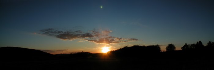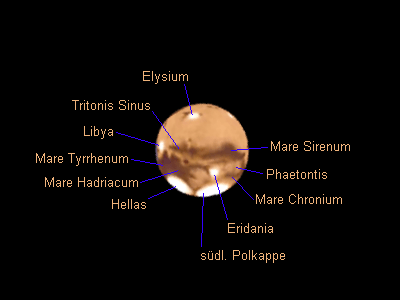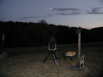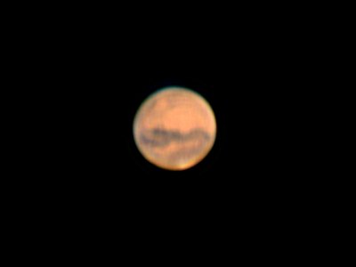 Ein wunderschöner, aber kühler Abend verleitet mich nach einer wetterbedingten Pause unbedingt wieder zum Beobachten. Nach dem Aufbauen auf der Sofienalpe bemerke ich, was sich in den letzten Tagen geändert hat: Kaum mit dem Muskelspiel fertig, wird der Ruf nach einem Pullover laut. Es ist Herbst geworden! Nach einem mehr als nur malerischen Sonnenuntergang ist der Mond mein erstes Ziel. Wie es sich für die Jahreszeit gehört, steht er im Ersten Viertel tief im Süden, nahe Antares und dem noch immer sehr hellen Delta Scorpii. Doch schon ein Blick durchs 50mm Plössl ernüchtert mich: Das Seeing ist alles andere als gut. Keine Chance beim Mars? Zeitweise wird das Seeing aber sehr gut, Hoffnung keimt auf. Dann und wann ziehen harmlose Wolken durch, in ihrem Vorfeld bricht das Seeing zusammen, um nachher langsam wieder besser zu werden. Ich vertreibe mir die Zeit mit Mondschauen, ein paar Blicken zu M57 und M11 und -- Aufwärmübungen. Es ist unangenehm kühl geworden, nur mehr 9°C. Günther Eder ruft aus Mariazell an. Dort hat es nur mehr 1,4°C. Der Winter kommt. Keine Frage. Denn hinter mir funkelt Capella frech vom Himmel, Perseus ist auch schon da. Brrrr! Dann endlich Mars. Na ja, visuell zeitweise gar nicht so schlecht. Die Durchsicht ist gut, der Planet sehr hell, ich erkenne auch Deimos ohne nennenswerte Schwierigkeiten. Rund eine halbe Stunde später sind die Bedingungen so, dass ich mich an ein paar WebCam-Sequenzen mit 6m Brennweite (2x Barlow) wage. Trotz alles andere als gutem Seeing wird sogar einigermassen etwas daraus. Orange- und Blaufilter dienen wieder zum Verstärken des Kontrasts. Auffällig: Die Polkappe ist fast vollständig verschwunden, nur ein ganz kleiner Rest ist geblieben. Leider sind derzeit wieder die weniger interessanten Gegenden auf dem Mars zu sehen. Besser wird's nicht. Und es ist kalt. Also Abbau. Noch ein Unterschied zu vor ein paar Wochen: Es ist erst knapp nach 22 Uhr ...