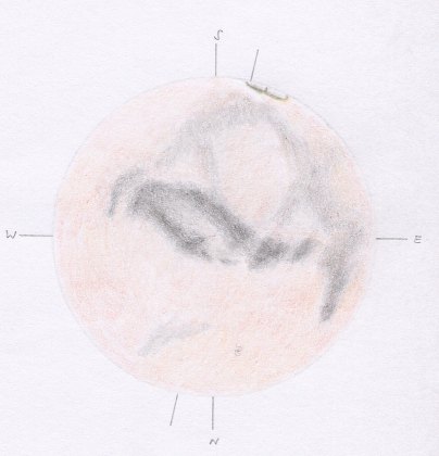 | Instrument: | 8"-Refraktor von Starke und Kammerer (ca. 2,5m Brennweite), 12-mm-Okular (ca. 200x), Orangefilter 23A, Farbwiedergabe ohne Filter | ||||||||