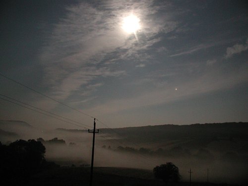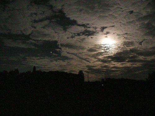 Am Morgen des 11. September, gegen 3.30 Uhr MESZ, ist die Wolkendecke nach zwei Tagen Regen fast gänzlich verschwunden. Herbstlicher Nebel liegt über der Landschaft, die vom Vollmond hell erleuchtet wird. Und auch Mars ist nicht zu übersehen.