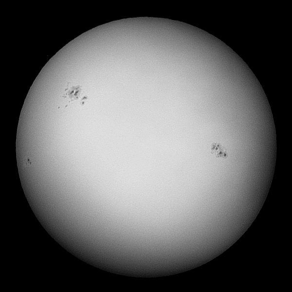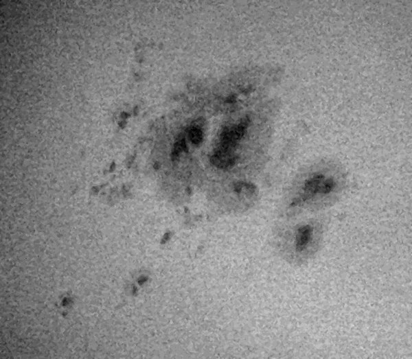 Auch heute ein Blick zur Sonne; die beiden grossen Fleckengruppen sind nach wie vor beeindruckend. Die Aufnahmen sind wirklich nur Schnappschüsse mit der ans Okular gehaltenen Digitalkamera. Durch Umwandlung der - durch den verwendeten Zeiss SFO80-Sonnenfilter rötlichen - Bilder in schwarzweiss konnte der Kontrast deutlich gesteigert werden. Auch im H-Alpha-Licht war die Sonne heute beeindruckend, leider konnten die zahlreichen Protuberanzen wegen der Cirren nicht fotografiert werden. |