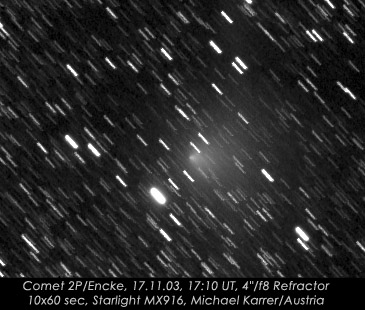 | Bericht: | hallo astrofreunde, komet encke. zwischen wolkenlücken war es sehr klar und ich versuchte erstmals, diesen kometen abzubilden. visuell sah ich nichts, die CCD technik war wieder einmal beeindrucked behilflich. kurze 10x60 sekunden belichtung, mehr war nicht drinnen. auf den kometenkopf nachzuführen war selbst für den lichtempfindlichen CCD chip nicht möglich, jeder stern im umfeld war heller. mfg michael karrer