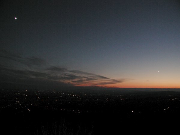 Auf Bolam 21km ist eben Verlass. Nach einem grauslichen Freitag und einem doch noch recht grauen Samstagvormittag klarte es, wie in dem italiensichen Wettermodell vorhergesagt, am Nachmittag auf. Gegen 16 Uhr, eine halbe Stunde vor Beginn des Sternabends, erwartete uns ein wolkenloser, strahlender Dämmerungshimmel mit zunehmendem Mond und einer nicht mehr zu übersehenden Venus. Erfreulich auch, dass trotz des Termins an einem Advent-Einkaufssamstag (während die Geschäfte noch geöffnet haben) und dem erst spät einsetzenden Schönwetter doch einige Besucher gezielt zu unserem Sternabend gekommen sind. Vor einigen Jahren fielen noch Ferienspielabende im Sommer aus, heute kommen Besucher selbst im November an einem Einkaufssamstag Sterngucken. Wir haben in der Astronomie wirklich einiges erreicht. Doch nun zu unserem Sternabend. Der Himmel ist wie gesagt äusserst attraktiv mit Mondsichel, Venus und den attraktiven Dämmerungsfarben. Gar nicht leicht, das im Bild festzuhalten.