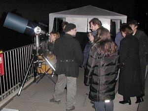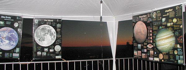 Unsere ersten Gäste, eine Familie, helfen auch beim Aufbau unseres Zeltes, da wir anfangs, auch bedingt durch den Einkaufssamstag, personell etwas unterbesetzt sind. Aber da unsere Art, Astronomie zu präsentieren, immer sehr familiär ist, ist das auch weiter kein Problem. Bereitwillig packen alle zu. Die Venus ist das erste Objekt im Fernrohr. Noch nicht sehr attraktiv, steht sie doch noch knapp nach der oberen Konjunktion und ist klein, rund und voll. Doch es ist der Beginn der Sichtbarkeit vor dem Transit!