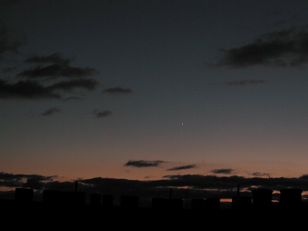 Venus ist jetzt in der Dämmerung eigentlich nicht mehr zu übersehen, hier ein Schnappschuss aus dem Wohnzimmerfenster, 1/20s bei 100 ASA. Im Fernrohr ist unser Schwesterplanet allerdings noch nicht interessant. Aber nicht vergessen: Es ist die Abendsichtbarkeit vor dem Transit! |