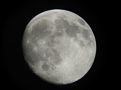 Der schon recht volle Mond strahlt vom Himmel, im Fernrohr werden