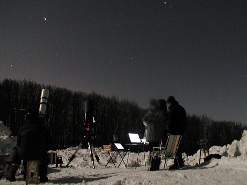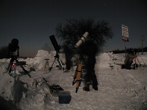 | Bericht: | Ausgehungert vom anhaltenden Schlechtwetter macht ein schöner, klarer Nachmittag die Entscheidung zum Beobachten nicht schwer. Da können auch die Schneemassen und die zu erwartenden niedrigen Temperaturen kein Hindernis sein. Auf der Sofienalpe stehen schon einige Geräte. Irgendwer, dem unser Dank gilt, hat einen schönen, ebenen Platz hinter dem Parkplatz ausgeschaufelt. Rings herum Schneemauern von einem halben bis einen Meter, recht beachtlich für die Sofienalpe. Es ist sehr kalt, aber zum Glück absolut Windstill, das macht die Kälte erträglich.