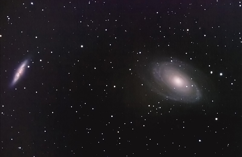 | Bericht: | Zur Sichtung von fuenf Planeten reichte es nicht ganz, da Merkur bereits durch die Huegeln im Westen verdeckt war als ich nach Hause kam. Dafuer stand Venus strahlend hell hoch am Himmel, Jupiter noch relativ niedrig im Osten, und dazwischen - nicht so auffallend - entlang der Ekliptik Saturn und Mars. Da die Transparenz recht gut war beschloss ich mich wieder einmal photographisch zu betaetigen, diesmal wollte ich M81 und M82 in Ursa Major ablichten. Ich machte eine Serie von 15x240sec./ISO1600. Ein Photo wurde durch ein durchfliegendes Flugzeug ruiniert, beim letzten der Serie stiess das Teleskop gegen ein Stativbein und wurde dadurch unbrauchbar. Es zahlt sich also aus eine Reihe von kuerzeren Belichtungen zu machen, dann bleiben solche "Katastrophen" verschmerzbar. Die Einzelbilder wurden in ImagesPlus addiert, mit NoiseNinja entrauscht und in Photoshop nachbearbeitet.