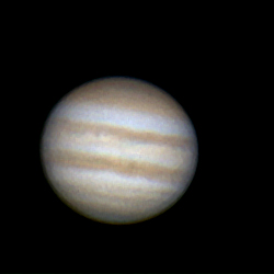 Danach machte ich eine Serie von Dunkelbildern fuer die Nachbearbeitung und schoss waehrenddessen einige Filmchen von Jupiter. Das Seeing war schon mal besser, aber trotzdem recht passabel. Roten Fleck gab es wieder einmal nicht zu sehen, dafuer war es bereits zu spaet. Philips ToUCam, effektive Brennweite 5400mm: