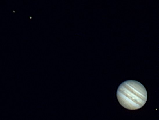 Die Phase der Venus ist jetzt schon sehr auffällig sichelförmig, was zu allerhand Verwunderung führt. Rasch mit einigen Verrenkungen die Stellungen von Sonne, Venus und Erde erklären - und auf den Transit hinweisen! Dass hier überhaupt ein Bild möglich ist, wo doch die tief stehende Venus vom Seeing geradezu grotesk verzerrt wird, verdanken wir nur der Aufnahmetechnik mit der Webcam. Jupiter zeigt sich einmal mehr sehr interessant. Wenngleich auch heute GRF und Jupitermonderscheinungen fehlen, ist der Blick dennoch schön. Vor allem das SEB (unten) ist reich strukturiert, und auffällig sind sehr dunkle, dünne Bänder am N-Rand des NEB und des NTB. Haben sie sich aus den am Vortag beobachteten dunklen SPOTs entwickelt? Gut möglich. Mars ist eher grotesk, winzig und noch dazu vom Seeing verzerrt. Saturn noch sehr schön, aber wieder ist in dieser Richtung das Seeing so schlecht, dass der Ring laufend verformt wird. Schade. Aber Venus und Jupiter sind eine Entschädigung, auch wenn wir immer wieder auf Wolkenlücken warten müssen. Ein fundamentaler Abend mit sehr gemütlichem Ausklang ...