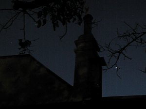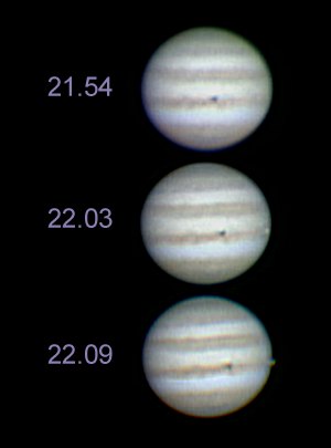 So richte ich das Teleskop dann noch am späten Abend zum Jupiter und kann noch die "zweite Halbzeit" der vierfachen Jupitermonderscheinung (je ein Durchgang und Schattenvorübergang von Io und Europa) verfolgen und im Bild festhalten.