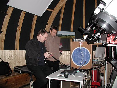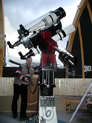 Mariazeller Nächte sind immer für Überraschungen gut, das ist bekannt. An diesem Abend bin ich an sich nicht darauf eingestellt. Vielmehr komme ich nach Mariazell, um die neue Montierung des Hauptinstruments kennen zu lernen und mit Günther Eder ein paar EDV-technische Sachen an der Sternwarte zu besprechen und durchzuführen. Die Ankunft auf der Sternwarte ist auch eine kleine Überraschung. So, als wäre das die natürlichste Sache der Welt, schliesst sich mir auf dem Weg vom Auto zur Sternwarte eine gar nicht so kleine Gruppe von Personen an und ist auch wirklich genau an der Sternwarte interessiert. Hochzeitsgäste aus Vorarlberg sind es und sie ahnen erst nach einiger Zeit, welchem Zufall sie es verdanken, dass gerade jetzt jemand auf die Sternwarte kommt. So gibt's eine kleine Führung, die erste am neuen Instrument, während sich der Himmel mehr und mehr verfinstert. Nach einer Stunde verlassen unsere weit gereisten Gäste die Sternwarte, bestens informiert, aber ohne einen echten Blick durchs Fernrohr, sieht man von ein paar Sonnenstrahlen zwischen Wolken ab. Es beginnt zu regnen. Günther und ich überlegen gerade, ob wir die Computeranlage in der Kuppel komplett auseinander reissen und neu installieren, als das Telefon läutet. Es ist Angelika, die uns mitteilt, dass der Himmel klar ist! Wir ändern unsere Pläne spontan und öffnen die Kuppel. Was jetzt folgt, kann man als die x-te Auflage des "Wunders von Mariazell" einstufen [bin schon gespannt, welche Mails und Anrufe ich jetzt wieder bekomme, wenn Google auf diesen Bericht stösst :-)]. Jedenfalls folgt die beste Beobachtungsnacht, an die ich mich an diesem Ort erinnern kann! Durchsicht jenseits von sehr gut, Seeing mindestens gut, wenn nicht sogar sehr gut, 7mag im kleinen Bären nach kurzer Dunkelanpassung. Die Kuppel hält den leichten Wind und die enorme Feuchtigkeit ab, was will man mehr. Venus ist gut, Saturn weniger. Ein seltsamer Effekt, von diversen Plätzen in letzter Zeit beobachtet. Bei Saturn ist das Seeing schlecher als sonstwo. Zufall, was sonst, aber trotzdem komisch. Und dann Jupiter ... - ... - ... ich kann das andächtige Schweigen nur schlecht wiedergeben, der Anblick ist einfach ein Traum. Und dann muss die Webcam her. Ja, die habe ich mit, und auch die CCD-Kamera. Warum? Siehe "Wunder von Mariazell". Man will ja auf alles vorbereitet sein. Also eine Aufnahmeserie mit 4m Brennweite. Viele Details schon im Live-Bild. Das muss gestackt werden. Wow ... Wir versuchen auch eine Aufnahme mit 2x-Barlowlinse, also 8m Brennweite. Da passt Jupiter gerade noch auf den Chip der ToUCam! Aber leider lassen sich nicht mehr Details herausholen, da ist doch Restseeing da. Es wird immer klarer, letzte Wolkenreste verschwinden. Gut, dass ich die CCD-Kamera mit dabei habe. Wir wollen das neue 80mm Teleobjektiv ausprobieren, ebenfalls eine Dauerleihgabe an die Sternwarte, wie auch der Starfire-Refraktor, für den das neue Objektiv jetzt als "Gegengewicht" fungiert. Ein erster Test zeigt: CCD mit Objektiv erfordert einen IR-Sperrfilter. Mit diesem werden die Sterne recht scharf, zumindest die schwächeren. Jetzt geht es an Belichtungstests. Zuletzt, auf der alten Gabelmontierung, lag das Limit bei 20 bis 30 Sekunden ohne Korrektur. Ich teste. Eine Minute: Gestochen scharfe Punkte! Zwei Minuten: Noch immer nadelfeine Sterne! Drei Minuten gehen auch noch. Erst bei 5 Minuten macht sich bemerkbar, dass die Montierung noch nicht hundertprozentig eingescheinert ist. Na, wenigstens bleibt noch ein bisserl Arbeit. Über uns strahlt der Frühlingshimmel in voller Pracht. Voll mit Galaxien! Günther hat einen Katalog, wir suchen uns die interessantesten Objekte und fotografieren sie nach. Serien von 10 Aufnahmen zu je 3 Minuten, das macht eine halbe Stunde Belichtungszeit pro Objekt, da bleibt viel Zeit zum Fachsimpeln und Blödeln. Und so nebenbei sehen wir recht feine Rohbilder. Ich nehme mit voller Auflösung, ohne Binning auf. Da ist das Signal/Rauschverhältnis der MX916 nicht gerade umwerfend, leider. Es ist wie der Witz mit dem Bier und dem Salzstangerl: Jetzt, wo die Nachführung gut funktioniert, kommen die Unzulänglichkeiten der Kamera ans Licht. Dunkelstromabzug hilft nur bedingt, denn der Dunkelstrom der MX916 ist ein rechtes Zufallsmuster, von den gröbsten Defekten einmal abgesehen. Jetzt die Bilder, für alle, die schon darauf warten. Viele sind es nicht, aber bei den Belichtungszeiten ist in einer Nacht nicht mehr drin. Eine zweite Aufnahmeserie der benachbarten Galaxie NGC4217 (hier Günther Eders Ausarbeitung) wird von Günther zu einem beeindruckenden Bildmosaik montiert, wir nennen es scherzhaft das "Mariazell Deep Field". Immerhin zeigt es Galaxien bis jenseits von 15mag. Einmal, mitten unter der Beobachtung, schreckt uns die neue Paramount Montierung durch Dauerhupen. Was ist passiert? Ein Defekt? Ein Softwarefehler? Nein, wir sind beim Nachführen in den "Umlegebereich" gekommen und das Fernrohr warnt uns, dass es nicht mehr lange nachführen kann. Intelligent! Nach drei Uhr ist die Müdigkeit größer als die Motivation, den einmalig klaren Himmel noch länger zu beobachten. Dabei gäbe es noch so viele Objekte! Die Milchstraße im Schwan steht schon recht hoch im Nordosten, die Leier schon beachtlich hoch im Osten, der Skorpion im Südosten ist auch schon aufgegangen, all die schönen Gegenden der warmen Jahreszeit. A propos: Es ist ziemlich kühl geworden. So schließen wir dann doch die Sternwarte. Es war eine Sternstunde. Noch dazu eine unerwartete, die zweite Überraschung an diesem Wochenende. Ob ich am nächsten Vormittag, etwas müde, ahne, dass es nicht die letzte an diesem Wochenende sein wird? |