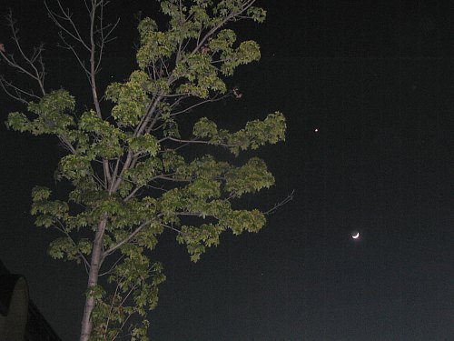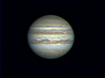 Wieder so ein klarer, milder Frühlingsabend, und der Anblick der Venus und der dünnen Sichel des zunehmenden Mondes darunter ist ja schon fast kitschig. Bei nicht ganz so gutem Seeing wie am Vortag untersuche ich wieder Jupiter, auch heute traue ich mich über eine Sequenz mit 2x-Barlowlinse, also 6m Brennweite. Im 7mm Pentax-Okular habe ich zeitweise ruhige Momente, in denen die dunklen Strukturen in den Bändern sehr deutlich heraus kommen. Die Farben sind zu erkennen, aber nicht so kräfig wie im Video. |